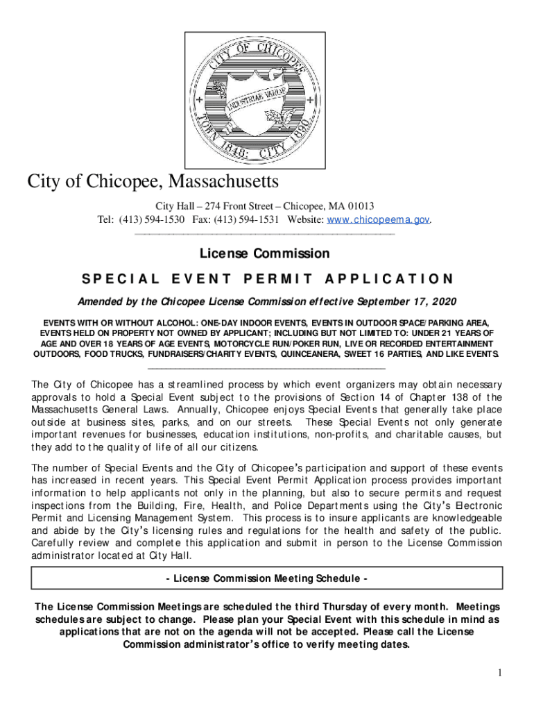 City of Chicopee, Massachusetts City Hall 274 Front Street Chicopee, MA 01013 Tel: (413) 5941530 Fax: (413) 5941531 Website: www.chicopeema.gov. ___License Commission SPECIAL EVENT PERMIT APPLICATION