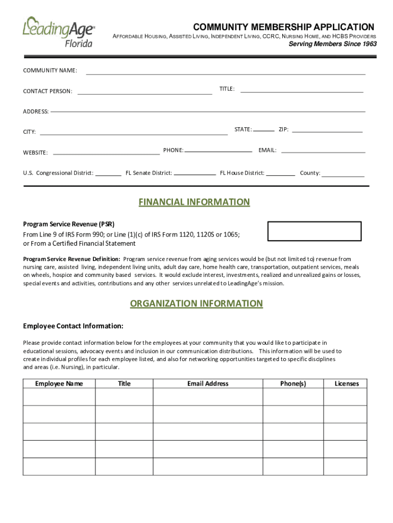 COMMUNITY MEMBERSHIP APPLICATION AFFORDABLE HOUSING, ASSISTED LIVING, INDEPENDENT LIVING, CCC, NURSING HOME, AND HUBS PROVIDERSServing Members Since 1963 COMMUNITYNAME: TITLE:CONTACTPERSON: ADDRESS: