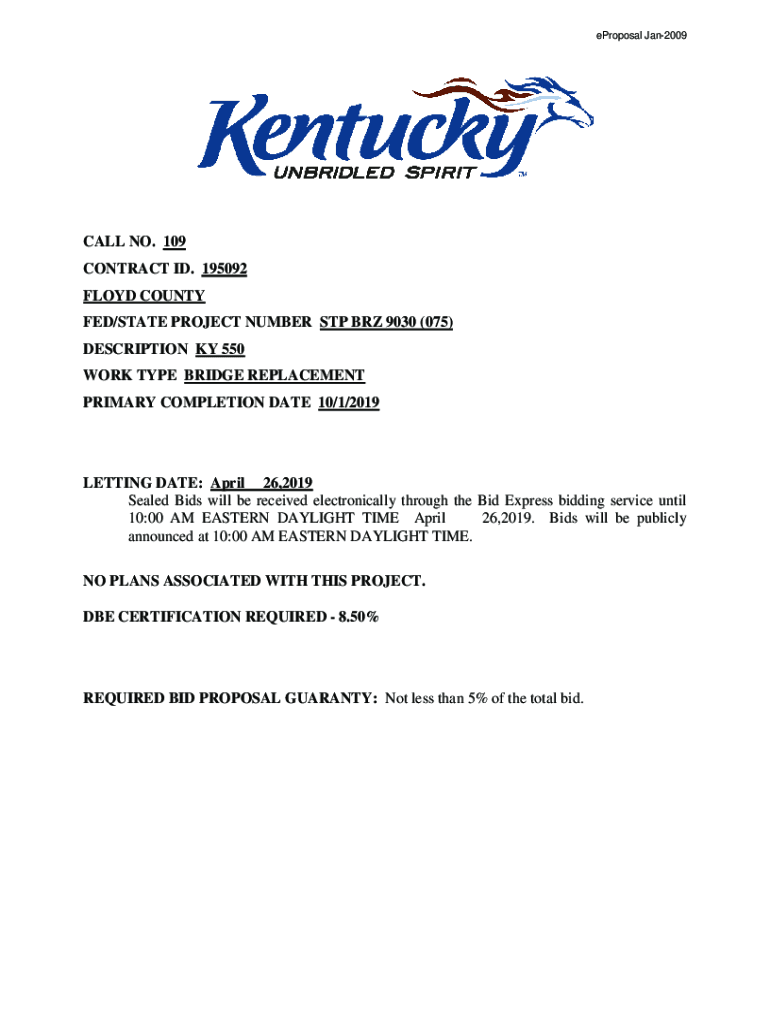 Proposal Jan2009CALL NO. 109 CONTRACT ID. 195092 FLOYD COUNTY FED/STATE PROJECT NUMBER STP BRZ 9030 (075) DESCRIPTION KY 550 WORK TYPE BRIDGE REPLACEMENT PRIMARY COMPLETION DATE 10/1/2019LETTING DATE: