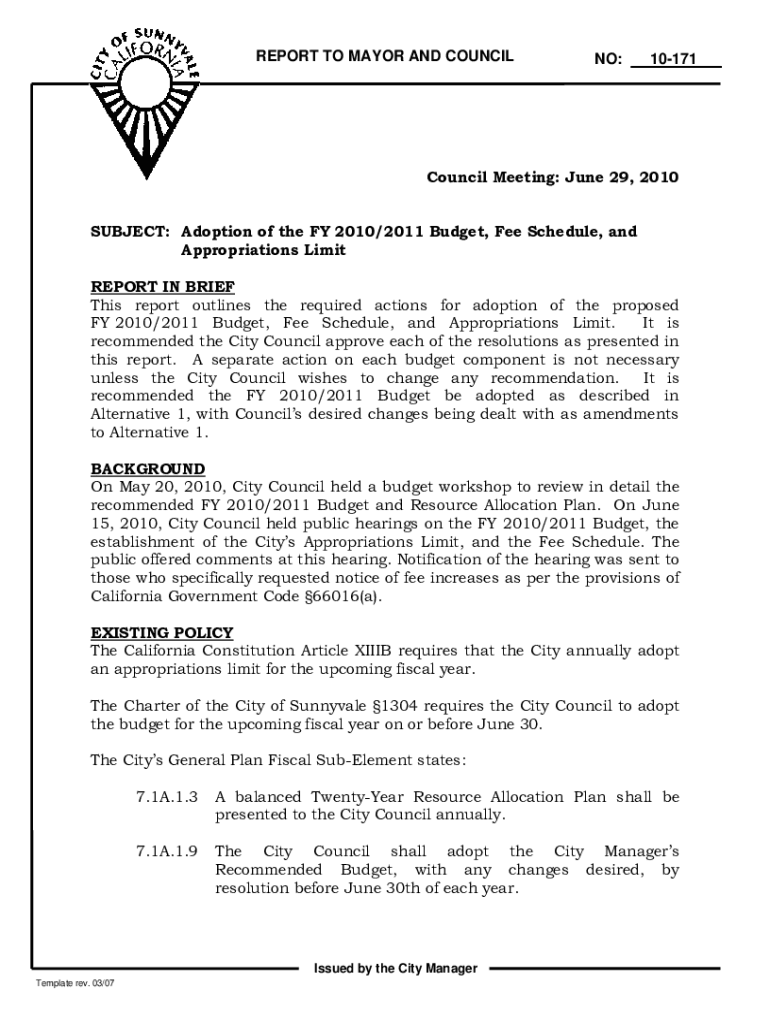 REPORT TO MAYOR AND COUNCIL NO:10171Council Meeting: June 29, 2010, SUBJECT: Adoption of the FY 2010/2011 Budget, Fee Schedule, and Appropriations Limit REPORT IN BRIEF This report outlines the required