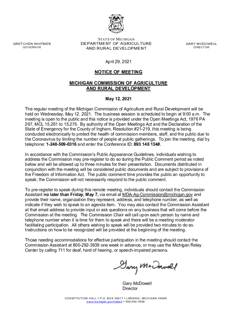 GRETCHEN WHITMER GOVERNORATE OF MICHIGAN DEPARTMENT OF AGRICULTURE AND RURAL DEVELOPMENTAL McDowell DIRECTOR April 29, 2021NOTICE OF MEETING MICHIGAN COMMISSION OF AGRICULTURE AND RURAL DEVELOPMENT