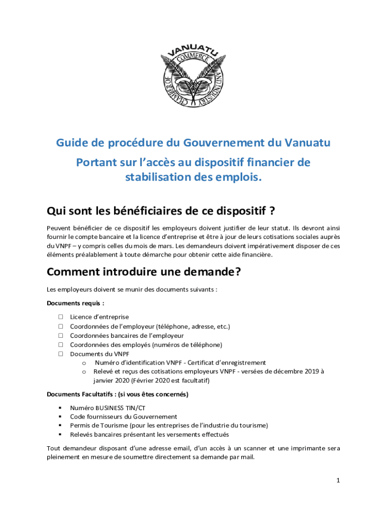 GuidedeprocdureduGouvernementduVanuatu Portantsurlaccsaudispositiffinancierde stabilisationdesemplois. Quisontlesbnficiairesdecedispositif? Event officer de CE disposition LES employers driven justified