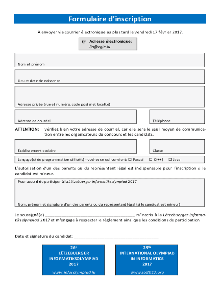 Formula ire d\'inscription envoy her via courier Veronique AU plus tard LE vended 17 frier 2017. @ Address Veronique: lio@cgie.luNom et panoplies ET date de naissanceAdresse drive (rue ET humor, code