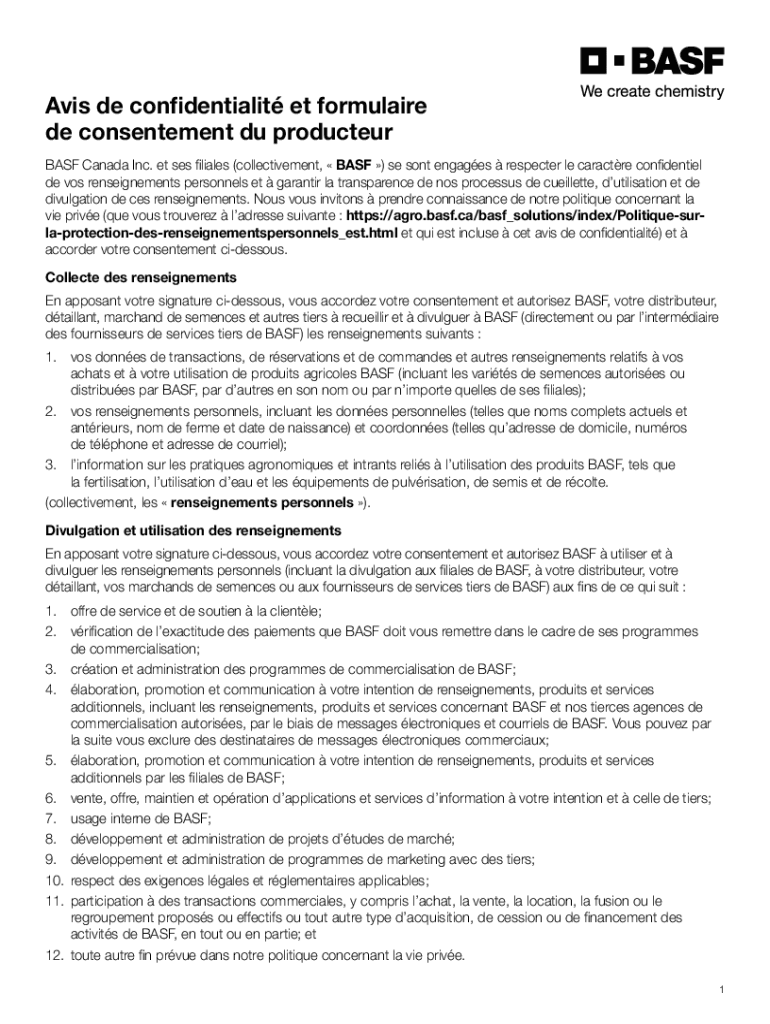 Avis de confidentiality ET formula ire DE contentment Du producer BASF Canada Inc. et SES filial BS (collectivement, BASF) SE sent engages respecter LE character confidential de Los restatements personnel