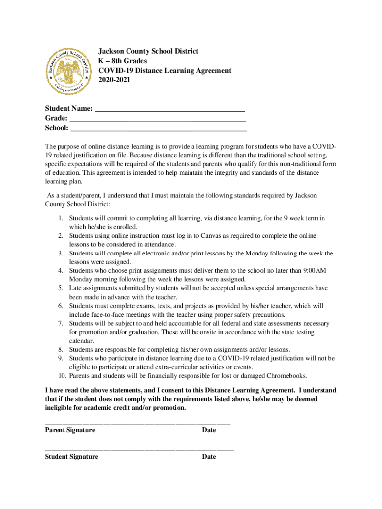 Jackson County School District K 8th Grades COVID-19 Distance Learning Agreement 20202021Student Name: ___ Grade: ___ School: ___ The purpose of online distance learning is to provide a learning program