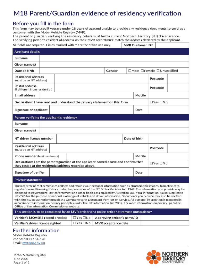 Get the free PDF M18 Parent/Guardian evidence of residency verification - Northern ... - nt gov