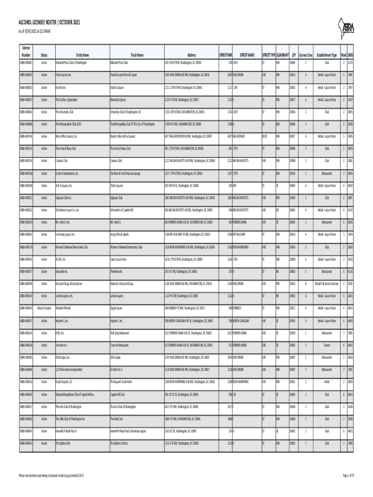 ALCOHOLLICENSEEROSTER|OCTOBER2021 Asof9/30/2021at11:34AM License NumberStatusABRA000001ActiveNationalPressClubofWashingtonNationalPressClub52914THSTNW,Washington,DC20004ABRA000010ActivePaulsLiquorsInc.