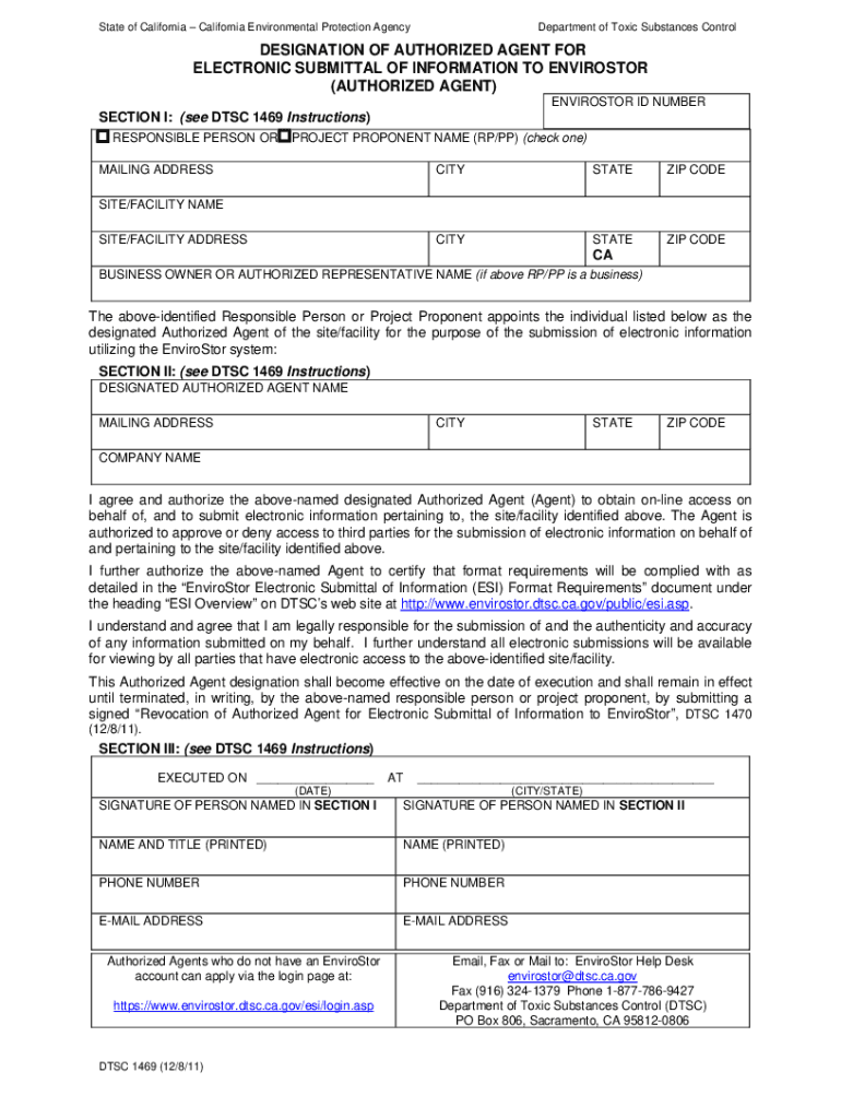 State of California Environmental Protection AgencyDepartment of Toxic Substances ControlDESIGNATION OF AUTHORIZED AGENT FOR ELECTRONIC SUBMITTAL OF INFORMATION TO ENVIROSTOR (AUTHORIZED AGENT) ENVIROSTOR