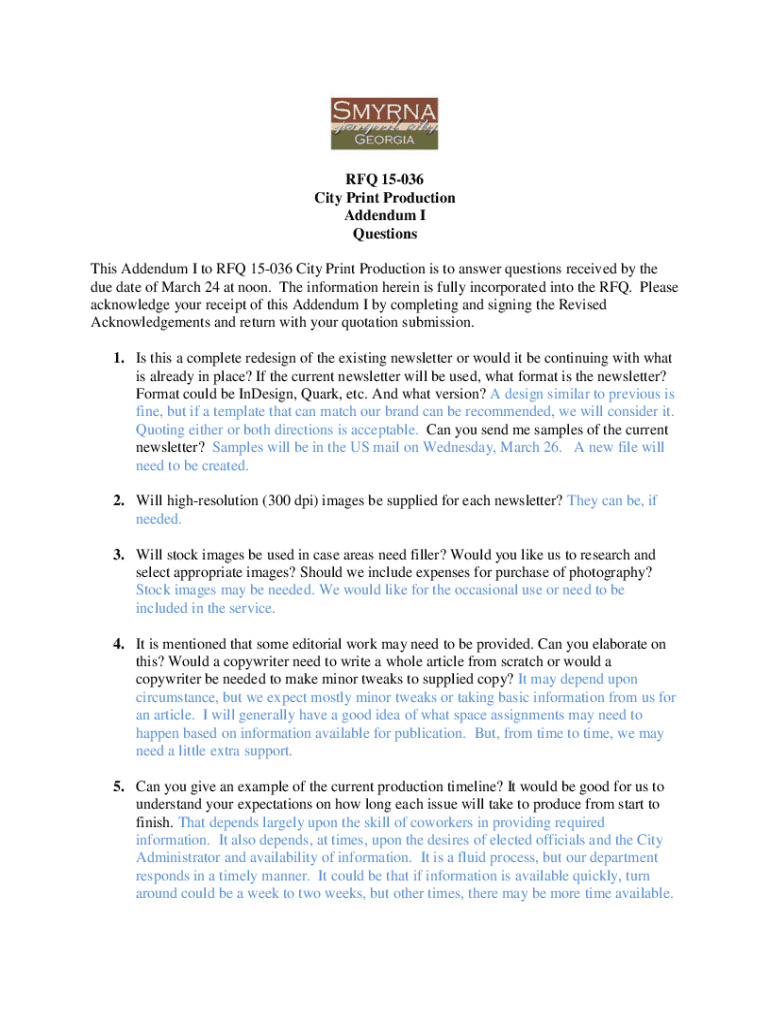 RFQ 15036 City Print Production Addendum I Question This Addendum I to RFQ 15036 City Print Production is to answer questions received by the due date of March 24 at noon. The information herein is