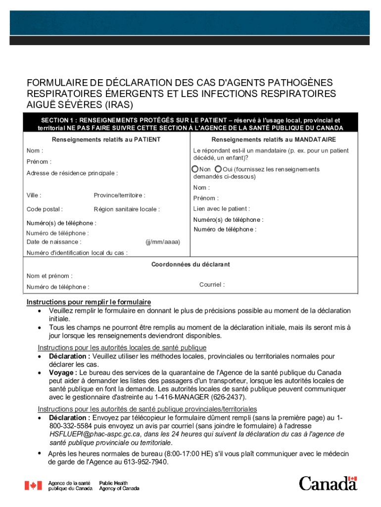 FORMULA IRE DE DECLARATION DES CAS D\'AGENTSPATHOGENSRESPIRATORSSEMERGENTS ET LES INFECTIONSRESPIRATORSSAIGUSIRESS (IRAS) SECTION 1 :REASSIGNMENTSSPRONGSS SUR LE PATIENTservev l\'usage local, provinciaETet