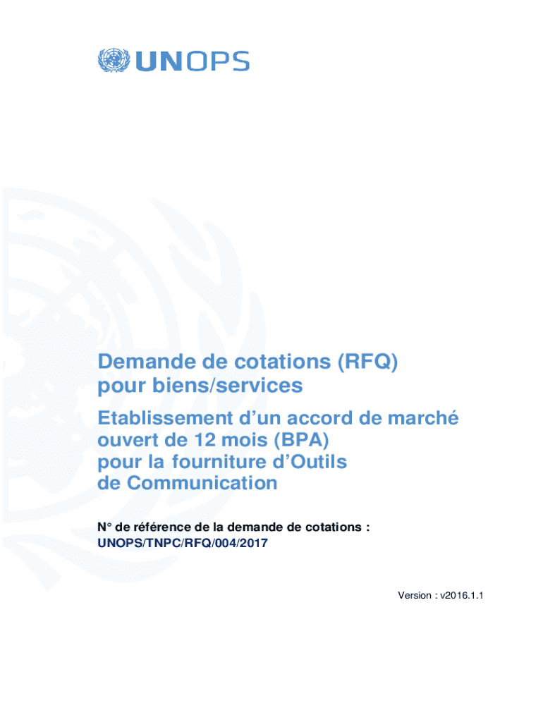 Demand DE citations (RFQ) pour bins/servicesEstablishmentt dun accorded marchovertt de 12moists (BPA) pour lafurnitureedutiess de Communication N deference DE demand recitations :UNITSSNPCPC/RFQ/004/2017Version