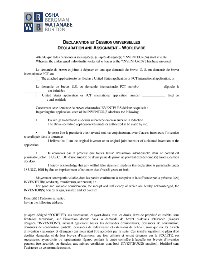 Get the free French OBWB Declaration and Assignment - Worldwide as MS Word Document