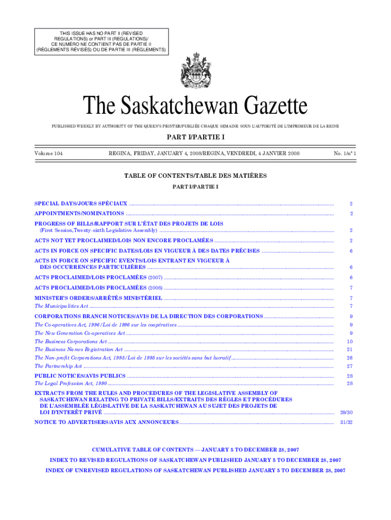 THIS ISSUE HAS NO PART II (REVISED REGULATIONS) or PART III (REGULATIONS)/ SASKATCHEWAN GAZETTE, JANUARY 4,2008,8 CENU MRO CONTENT PASBETHEEPARTIESE II ELEMENTS SRV ISIS)OF DEPARTMENT III ELEMENTS)1The