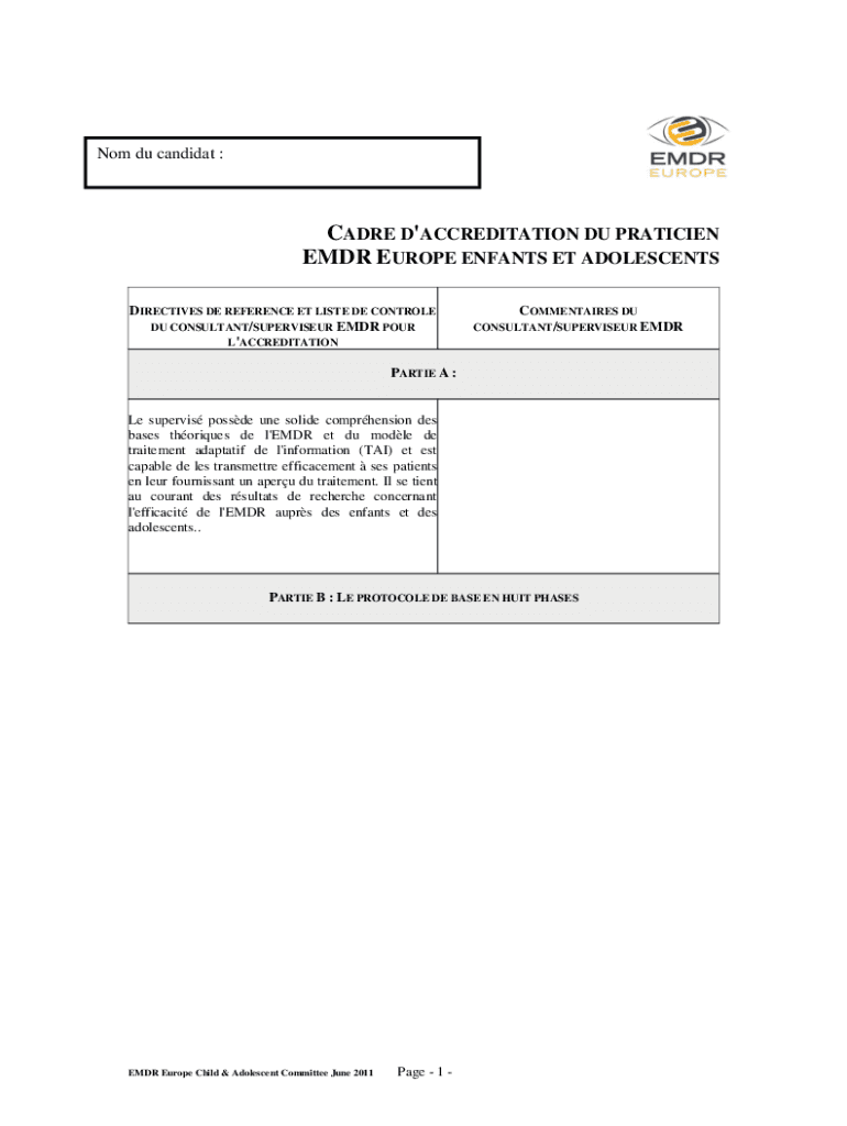 Not Du candidate :CADRE D\'ACCREDITATION DUPRACTICIANNMDRR EUROPEENFANT SETT ADOLESCENTS DIRECTIVES DE REFERENCE ELITE DECONTROL EDUC CONSULTANTSUPERVISEDUMDRDR POUR L\'ACCREDITATIONCOMMENTAIRES DU