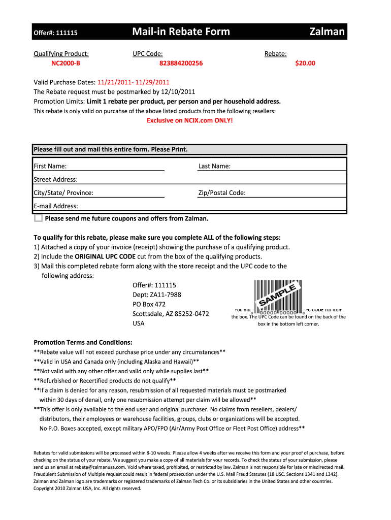 Offer#: 111115 Mail-in Rebate Form Qualifying Product: NC2000-B UPC Code: 823884200256 Kalman Rebate: $20.00 Valid Purchase Dates: 11/21/2011 11/29/2011 The Rebate request must be postmarked by 12/10/2011