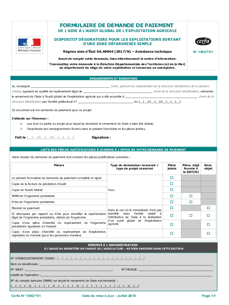 FORMULA IRE DE DEMAND DE PAVEMENT DEL AIDE AUDIT GLOBAL DEL EXPLOITATION AGRICOLA DISPOSITION DGORATOIRE POUR LES EXPLOITATION SORT ANT DUNE ZONE FAVORITE SIMPLE Regime aided that SA.49044 (2017/N)