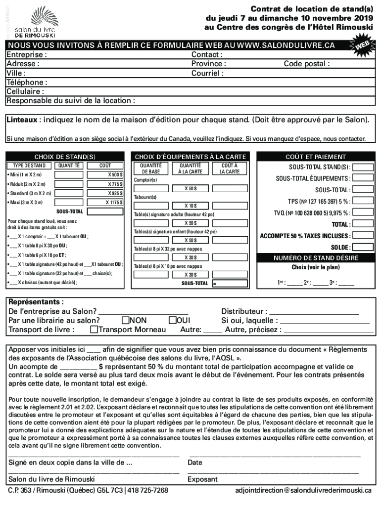 Version 20190521Contrat de location DE stand(s) Du Jedi 7 au Comanche 10 November 2019 au Center DES congas de LHTEC RimouskiNOUS VOWS INVITES REPAIR CE FORMULA IRE WEB AU WWW.SALONDULIVRE.CA Enterprise