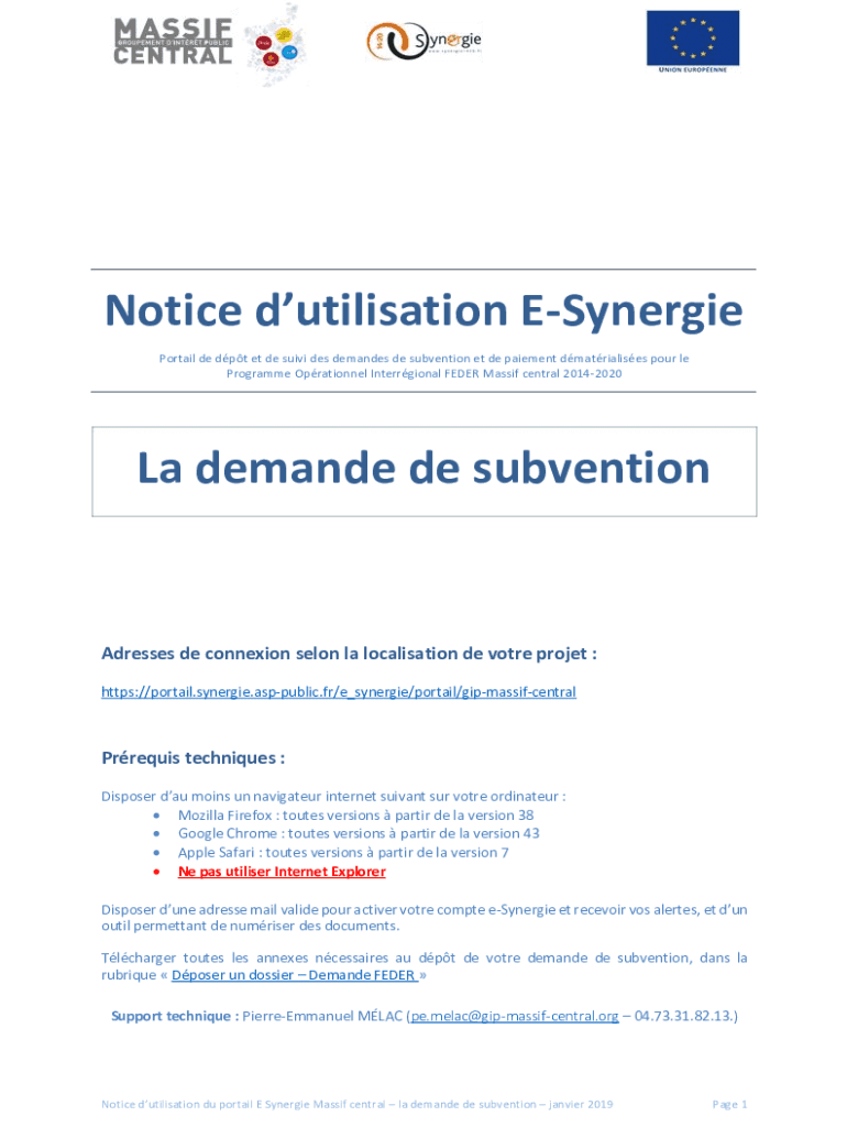 Notice utilization Synergies Portal DE dpt et de soon DES demands DE subvention et de pavement materializes pour LE Program Operational Interregional FEDER Massif central 20142020La demand de subventionAdresses