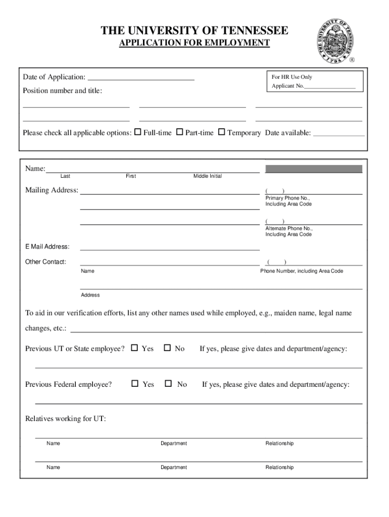 THE UNIVERSITY OF TENNESSEE APPLICATION FOR EMPLOYMENTDate of Application: ___For HR Use Only Applicant No.___Position number and title: __________________Please check all applicable options: Full