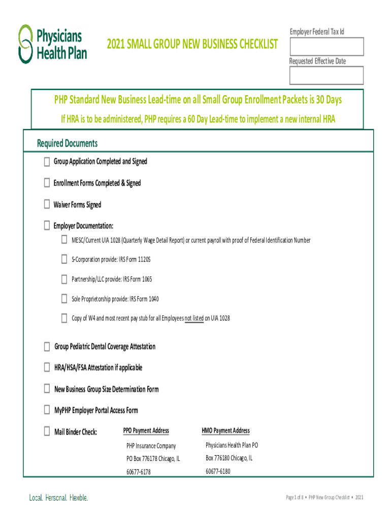 2021 SMALL GROUP NEW BUSINESS CHECKLISTEmployer Federal Tax I'd Requested Effective Date PHP Standard New Business Lead time on all Small Group Enrollment Packets is 30 Days If HRA is to be administered,