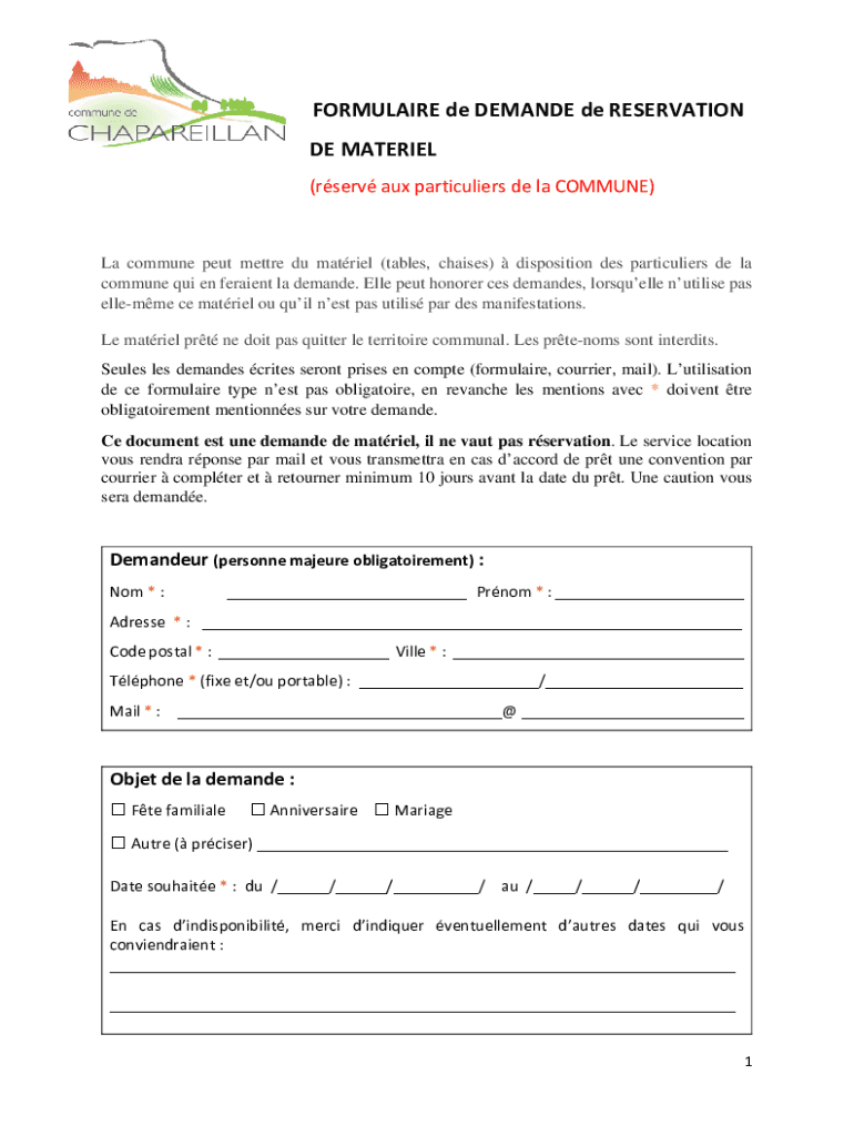 FORMULA IRE de DEMANDE de RESERVATION DE MATERIEL (serve aux particulars DE la COMMUNE)La commune put mettle Du material (tables, chaises) disposition DES particulars DE la commune quit en fervent