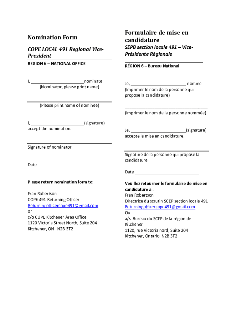 Nomination FormFormulaire demise en candidatureCOPE LOCAL 491 Regional VicePresidentSEPB section locale 491 VicePrsidente RgionaleREGION 6 NATIONAL OFFICE, ___nominate (Nominator, please print name)(Please