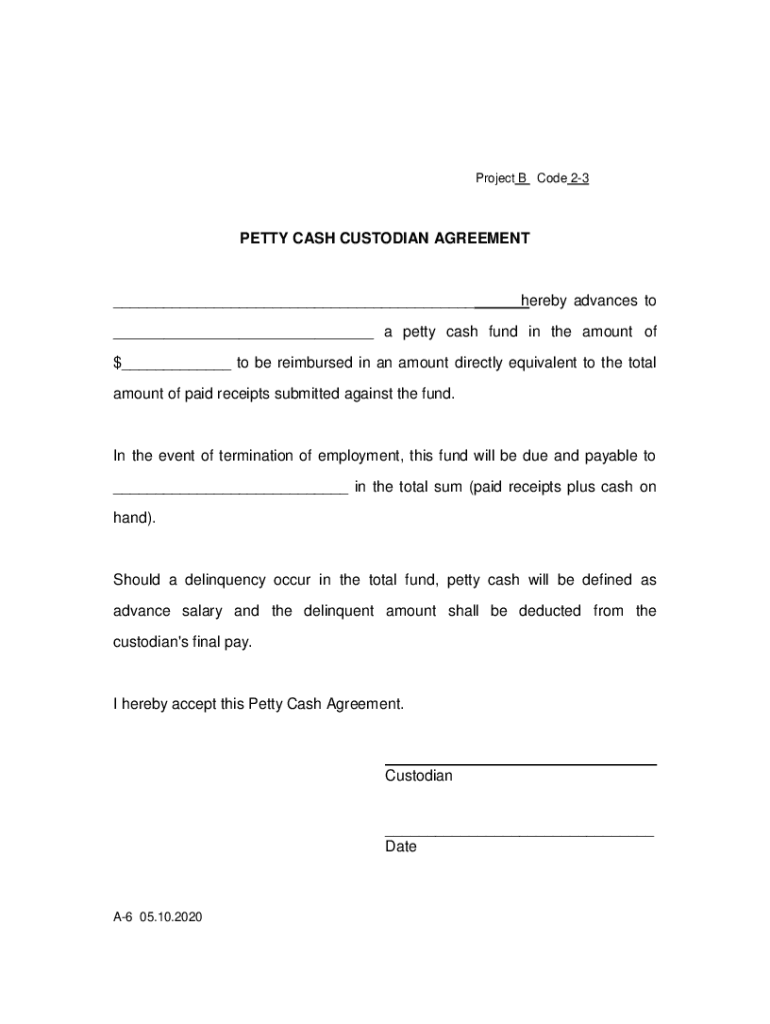 Project B Code 23PETTY CASH CUSTODIAN AGREEMENT___hereby advances to___ a petty cash fund in the amount of $___ to be reimbursed in an amount directly equivalent to the total amount of paid receipts