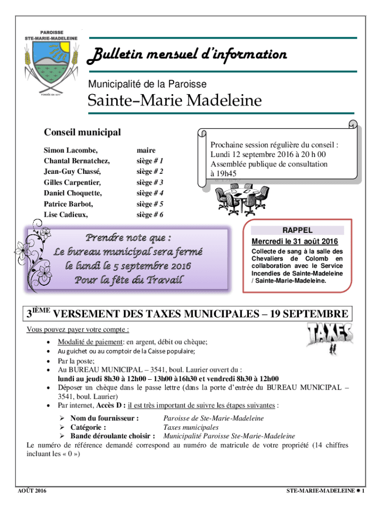Bulletin Manuel information Municipality de la ParoisseSainteMarie Madeleine Conrail municipal Simon Wycombe, Chantal Natchez, Jean Guy Class, Gilles Carpentier, Daniel Coquette, Patrice Bar bot,