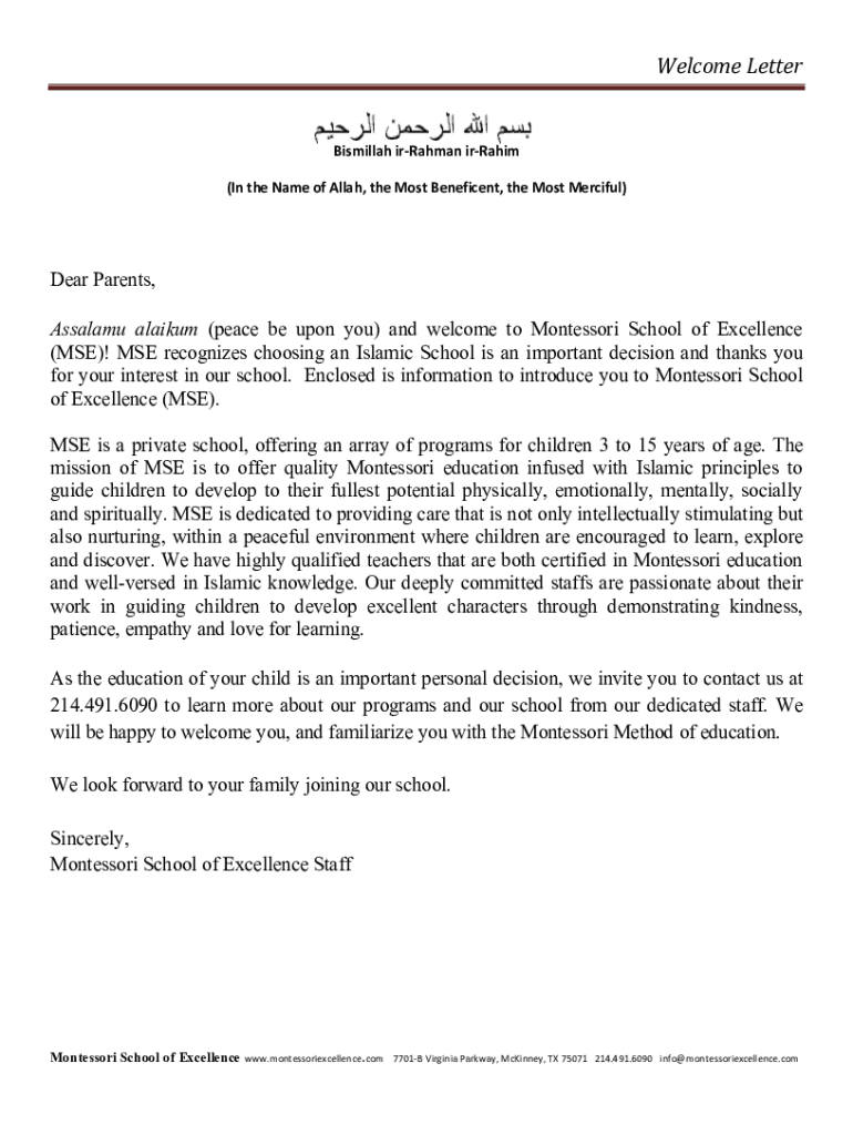 Welcome LetterBismillah Brahman Ibrahim (In the Name of Allah, the Most Beneficent, the Most Merciful)Dear Parents, Assalamu alaikum (peace be upon you) and welcome to Montessori School of Excellence