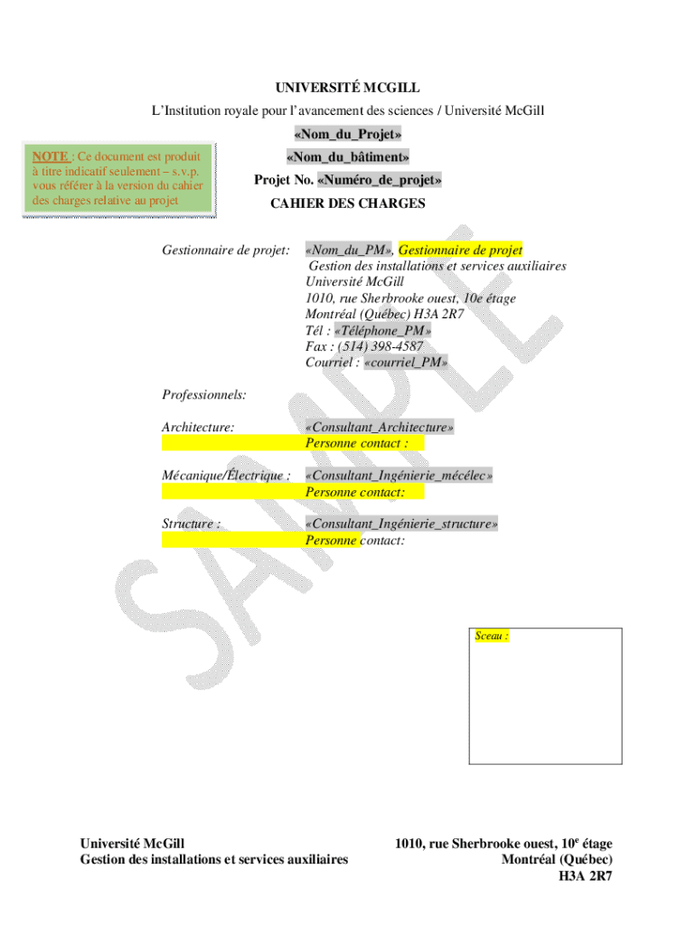 UNIVERSITY McGill Institution royale pour advancement DES sciences /University McGillNotm_du_Projet NOTE : Ce document estproductttitleeindicatefelementt s.v.p.vowssrarerr la versionDuucashierrDESs