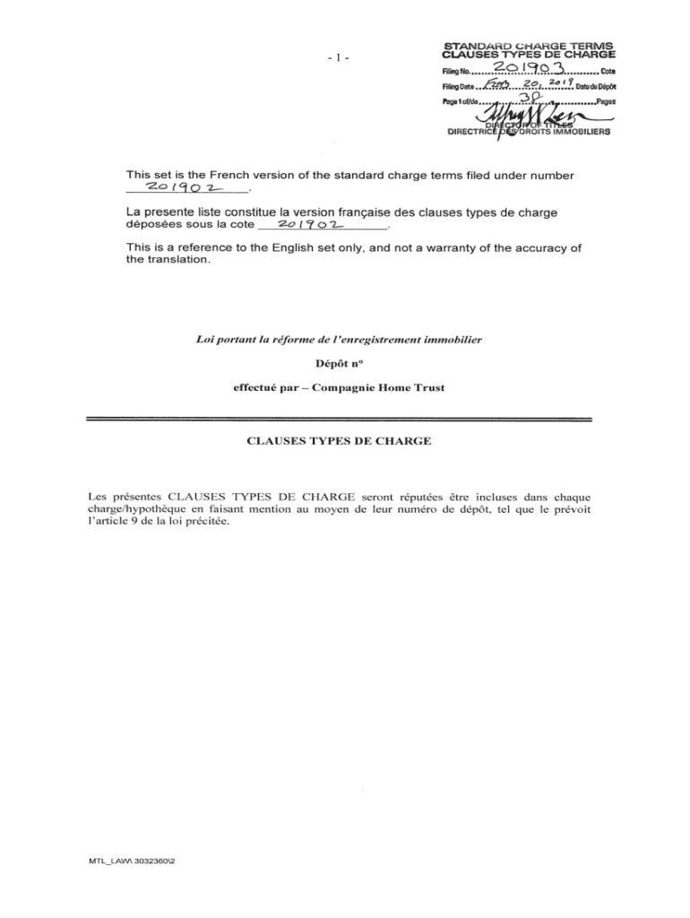 STANDARD CHARGE TERMS CLAUSES TYPES DE CHARGE Filing No...2.0130.1....... ... Ceiling Date. JR.... Sr.?.l. Of. !. ?. Date de DptThis set is the French version of the standard charge terms filed under