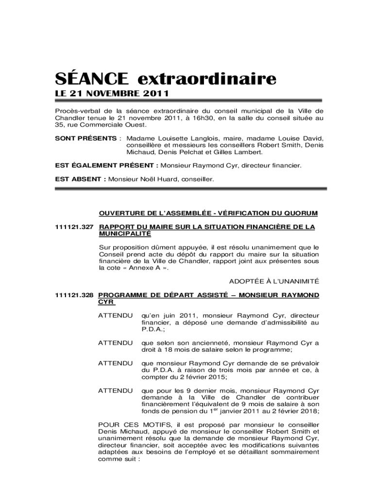 SINCE extraordinaire LE 21 NOVEMBER 2011 Procès-verbal DE la since extraordinaire Du Conrail municipal DE la Villa de Chandler tenure LE 21 November 2011, 16h30, en la sale Du Conrail site AU 35,