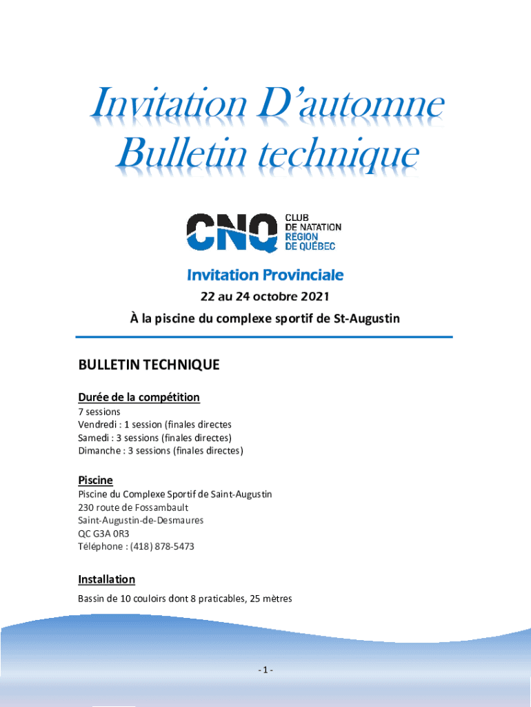 Invitation Autumn Bulletin technique Invitation Provincial 22 au 24 October 2021 la pis' cine Du complete sport if de StAugustinBULLETIN TECHNIQUE Due DE la competition 7 sessions Vended : 1 session