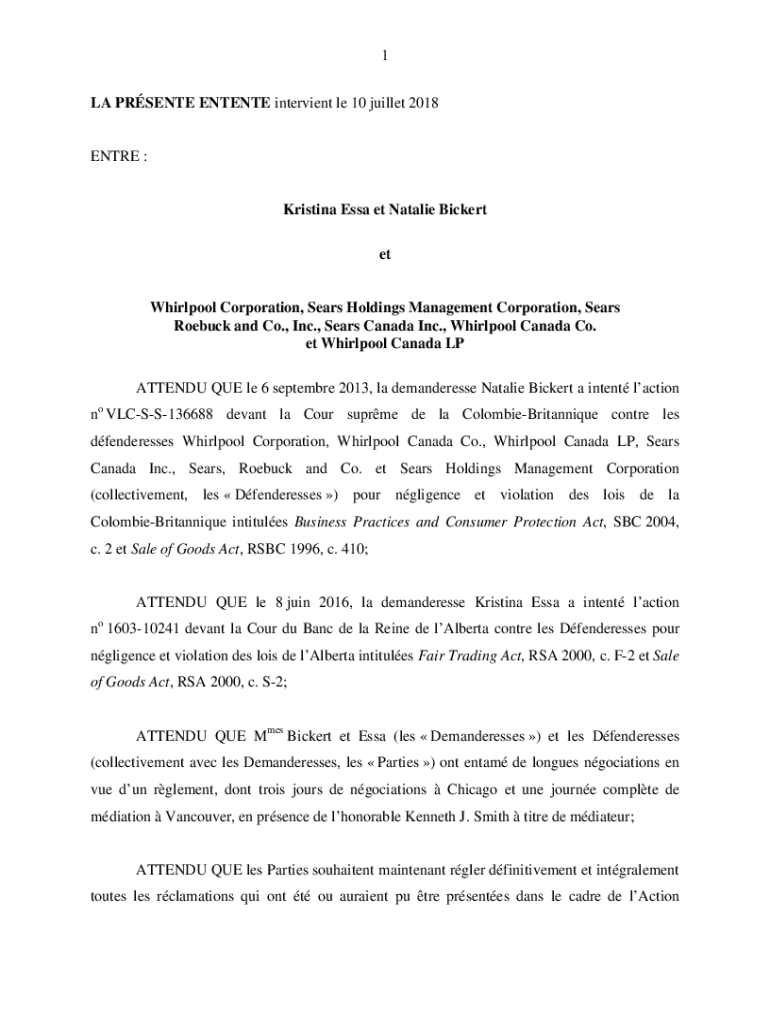 1 LA PRESENT ENTENTE interview LE 10 bullet 2018ENTRE :Kristina Essay et Natalie Bicker whirlpool Corporation, Sears Holdings Management Corporation, Sears Roebuck and Co., Inc., Sears Canada Inc.,