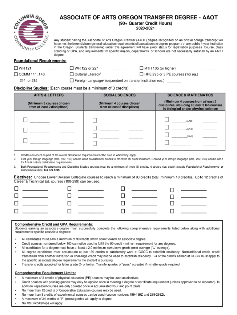 Get the free ASSOCIATE OF ARTS OREGON TRANSFER (AAOT) - State of Oregon