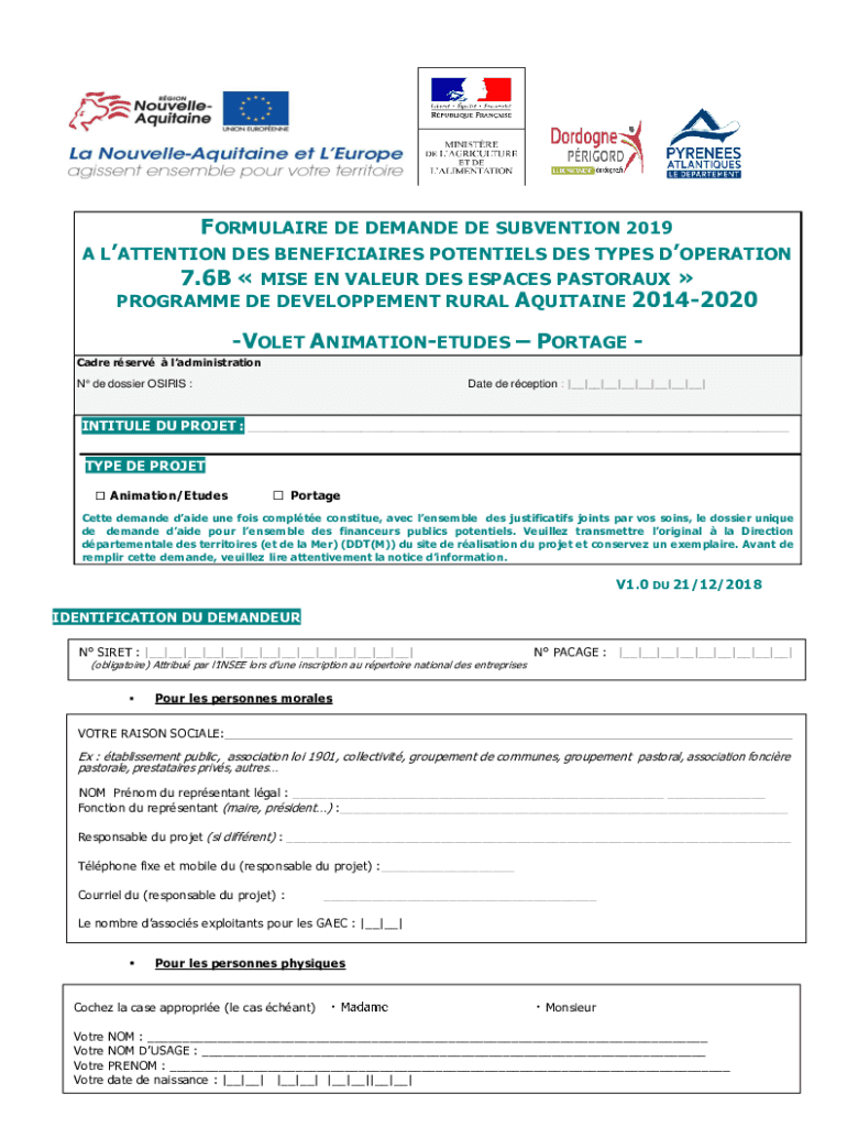 FORMULA IRE DE DEMAND DE SUBVENTION 2019 A ATTENTION DES BENEFICIARIES POTENTIALS DES TYPES OPERATION 7.6B MILE EN VAL EUR DESE SPACES PASTOR AUX Program DE DEVELOPMENT RURAL AQUITAINE 20142020 VIOLET