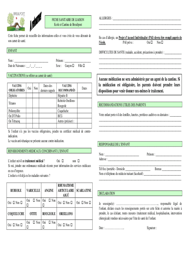 FICHE SANITARY DE LIAISON Cole et Canine de BreuilpontALLERGIES : ___ ___ ___Bette fiche permit DE rectally DES information utile set vows site DE vows Muir de son carpet DE sent. En CAS allergic,