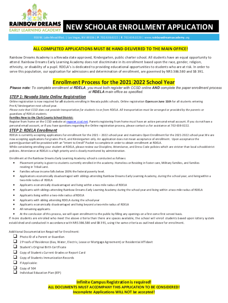 NEW SCHOLAR ENROLLMENT APPLICATION 950 W. Lake Mead Blvd. | Las Vegas, NV 89106 | P. 702.638.0222 | F. 702.638.0220 | www.rainbowdreamsacademy.orgALL COMPLETED APPLICATIONS MUST BE UNDELIVERED TO