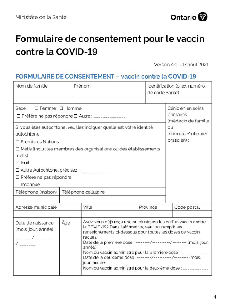 Toute personne souhaitant recevoir le vaccin COVID-19 dans un centre de vaccination en ligne doit remplir le formulaire de consentement en ligne.