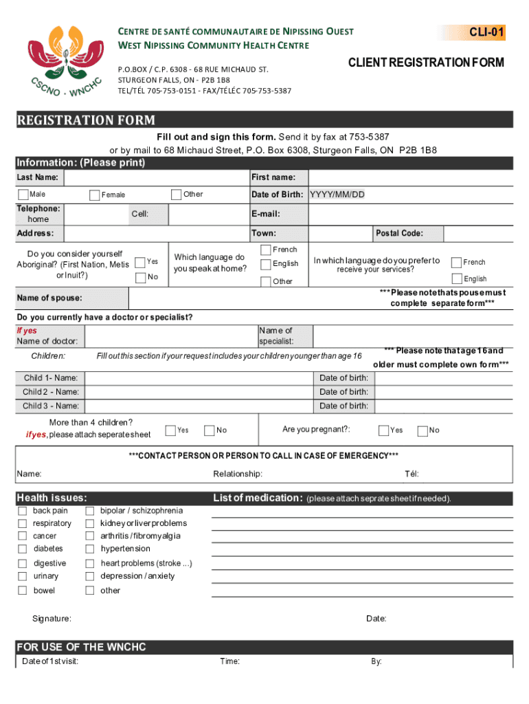 Center DES ANT COMMUNAUTAIRE DE PISSING ORESTES PISSING COMMUNITY HEALTH CENT REP. O.BOX / C.P. 6308 68 RUEMICHAELD ST.STURGEON FALLS, ON P2B 1B8TEL/TL 7057530151 FAX/TLC 7057535387CLI01CLIENT REGISTRATIPREREGISTRATIONIFormerlyill