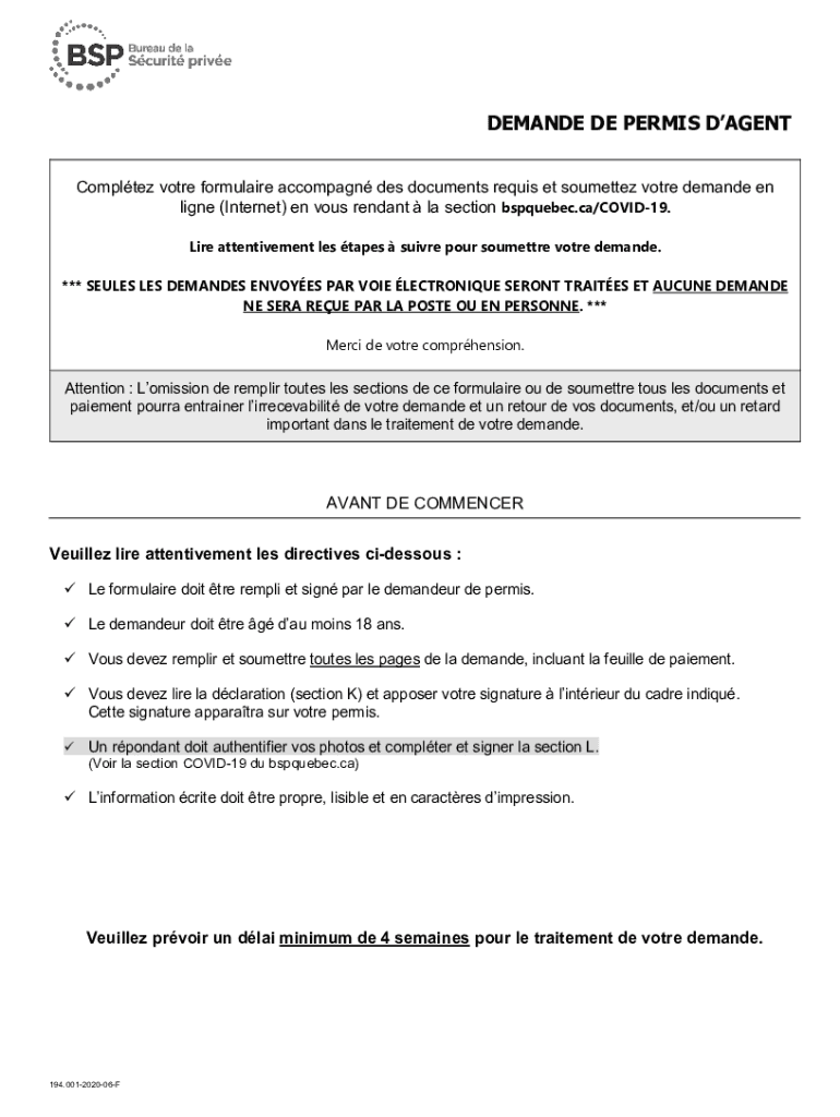 DEMAND DE PERMIT AGENT Completed vote formula ire accompany DES documents renew set roulette vote demand en line (Internet) en vows pendant la section bspquebec.ca/COVID19. Lireattentivenesstlest