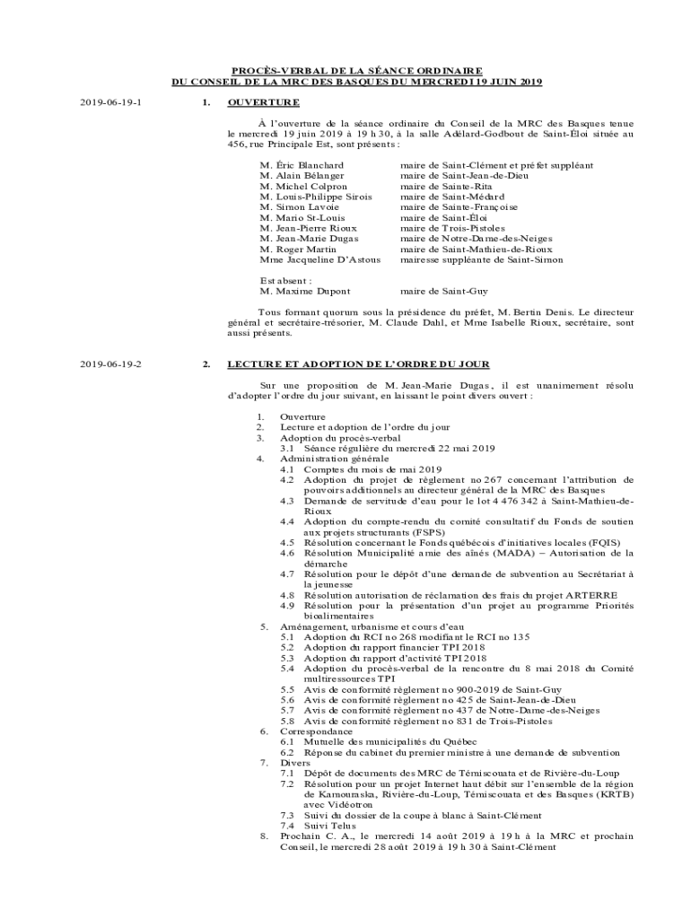 PROCÈS-VERBAL DE LA SINCE ORDINARY DU CONSENT DE LA MRC DES BASQUES DU MERCED 19 JOIN 2019 2019061911.OUVERTURE de la since ordinary Du Conrail de la MRC DES Basques tenure LE Merced 19 join 2019