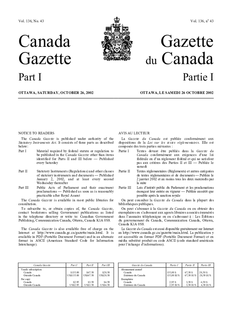 Vol. 136, no 43Vol. 136, No. 43Canada GazetteGazette du CanadaPart Parties OTTAWA, SATURDAY, OCTOBER 26, 2002OTTAWA, LE SAM EDI 26 OCTOBER 2002NOTICE TO READERS The Canada Gazette is published under