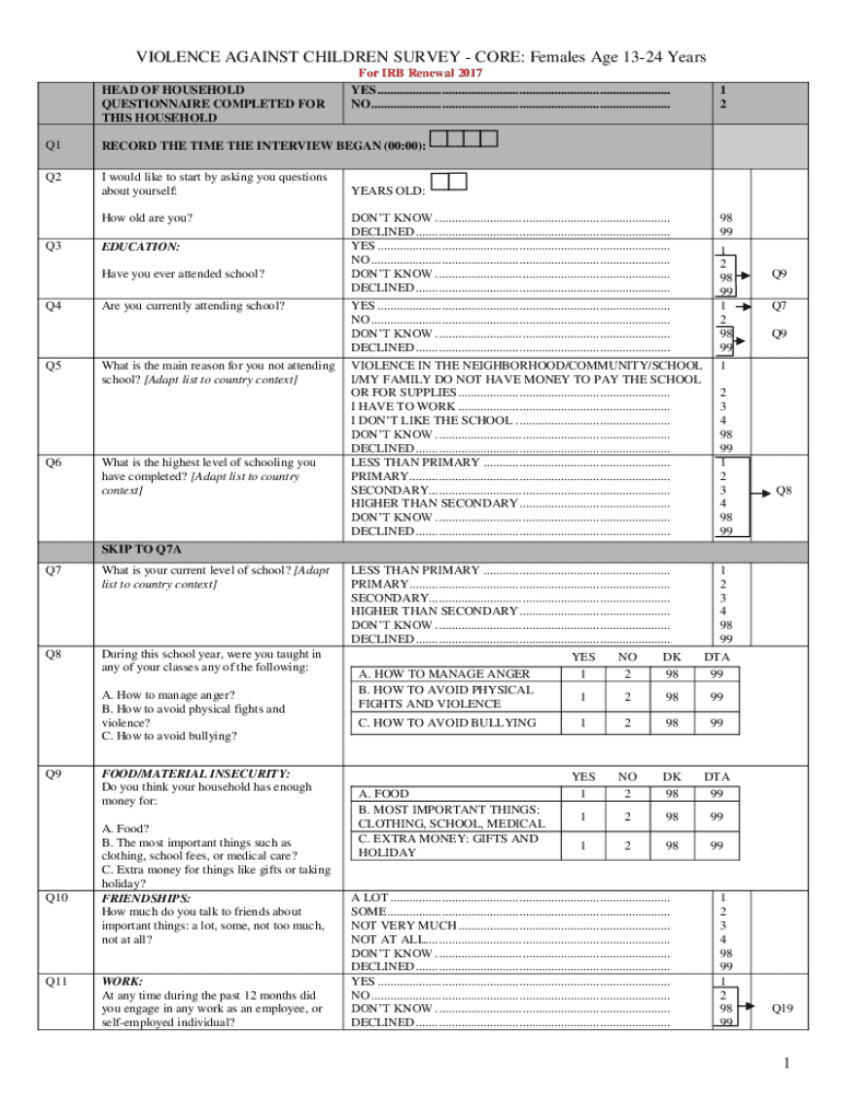 VIOLENCE AGAINST CHILDREN SURVEY CORE: Females Age 1324 Years HEAD OF HOUSEHOLD QUESTIONNAIRE COMPLETED FOR THIS Householder IRB Renewal 2017 YES ...........................................................................................