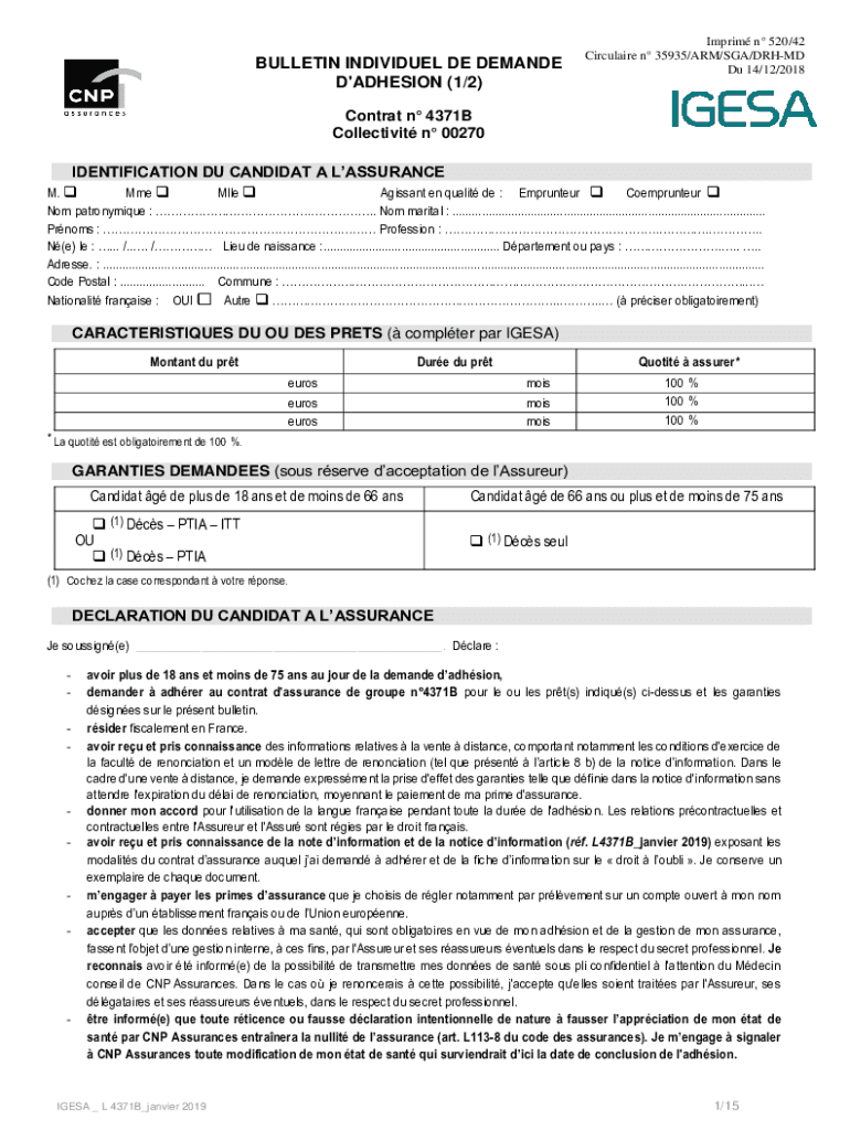 BULLETIN INDIVIDUAL DE DEMAND D\'ADHESION (1/2)Imp rim n 520/42 Circular n 35935/ARM/SGA/DR HMD Du 14/12/2018Contrat n 4371B Collectivist n 00270 IDENTIFICATION DU CANDIDATE A ASSURANCE M. Mme Mlle