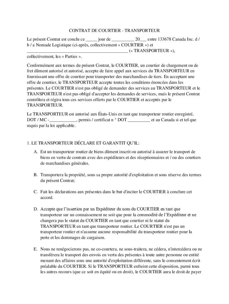 CONTRA TDE COURTIER TRANSPORTER Le present Contra test conclude CE ___ four DE ___ 20___ entire 133678 Canada Inc. d / b / NomadsdLogisticsuecarsrs, collectivement COURT) Stet __(TRANSPORTER)), collectivementlesses