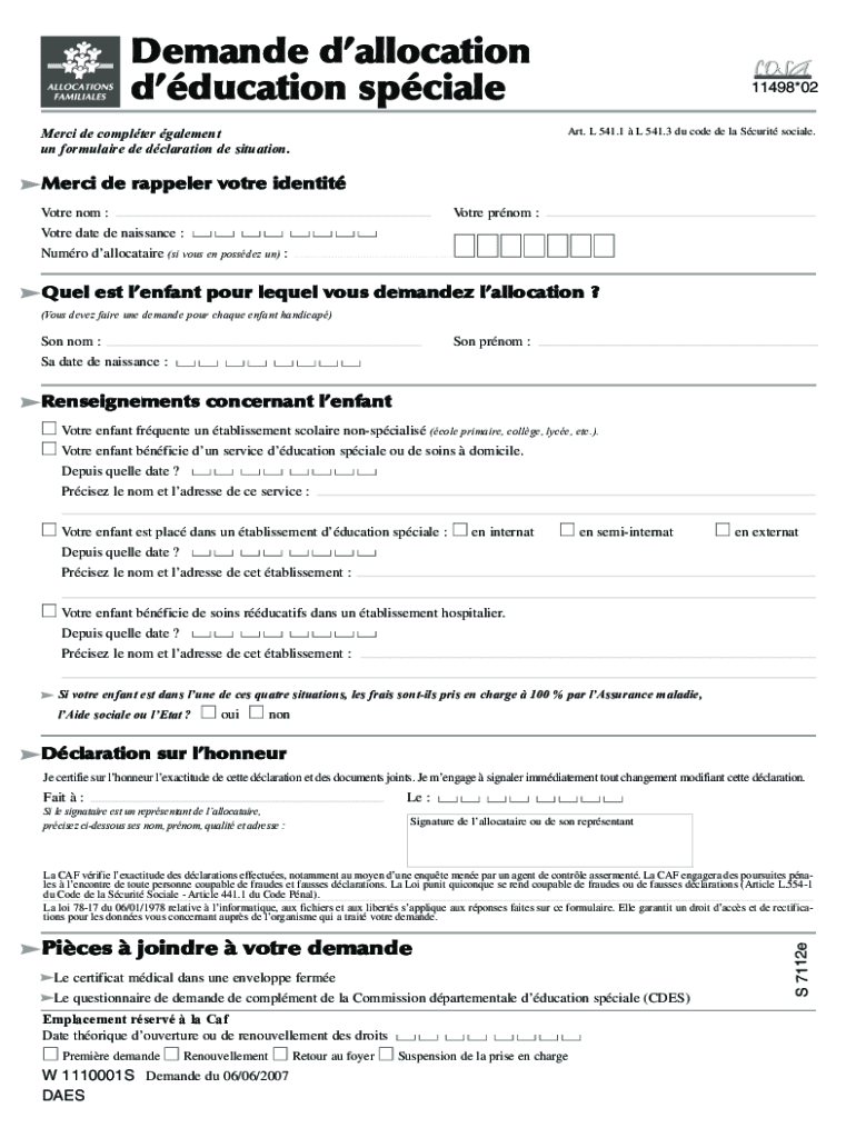Demanded allocation education social Merci de computer element UN formula ire DE declaration DE situation.11498×02 Art. L 541.1 L 541.3 Du code DE la Security social. Merci de rappel her vote identity