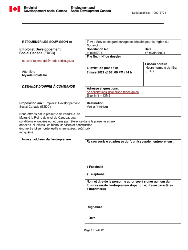 Solicitation No. 100016721RETOURNER LES COMMISSION :Employ ET Development Social Canada (EDS)Title: Service de gardiennage de security pour la region Du Nunavut. Solicitation No. Date 100016721 16