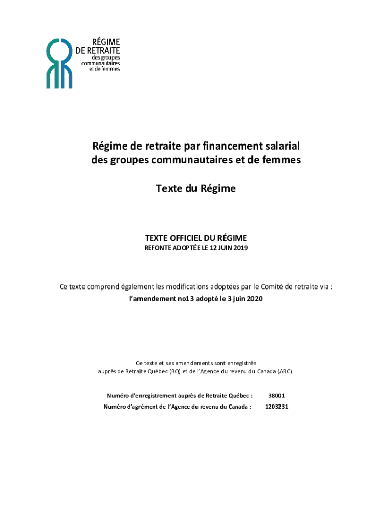 488Rgime de retrieve par advancement malarial DES groups communautaires et de fem mes Text du RgimeTEXTE OFFICIAL DU RGIMEREFONTE ADOPTED LE 12 JOIN 2019Ce text comp rend element LES modifications