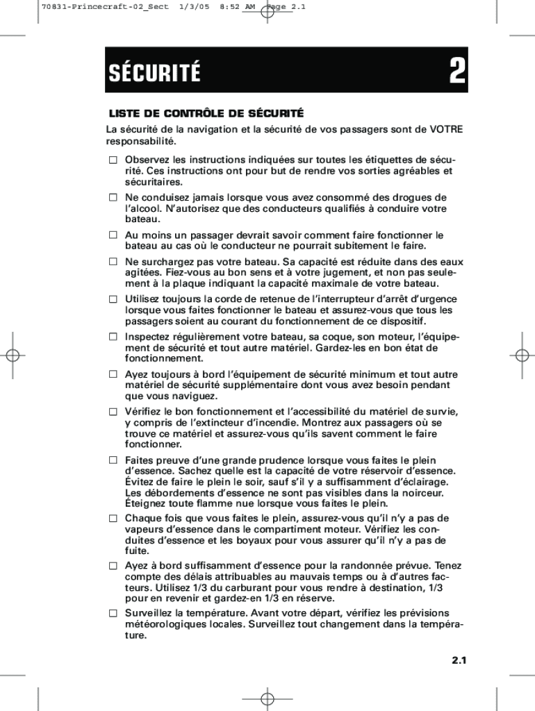70831Princecraft02_Sect1/3/058:5Rampagege 2.1SCURIT2LISTE CONT RLE LE SECURITY DE la navigatioETet security dLosopassagesrsentnt dVOTERresponsibilityitObservedeLESes instructionIndieseSURutoutseLESepiquetteses